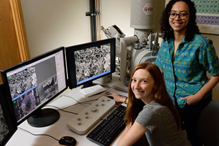Photo caption: Marley Dewey, left, and Aleczandria Tiffany examine how 3D-printed biomaterials can be used to reinforce the mineralized collagen scaffold with the help of the electron scanning microscope in the Microscopy Suite.
